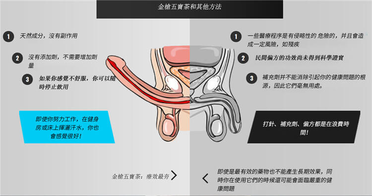 《金槍五寶茶》的三十幾味藥材補足腎氣,讓你在床上如金槍戰神,生活上班生龍活虎,精神抖擻!